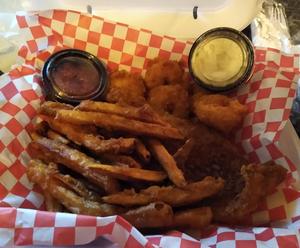 All baskets come with a choice of Fries, Kettle Chips, or Baked Potato and one of our sides